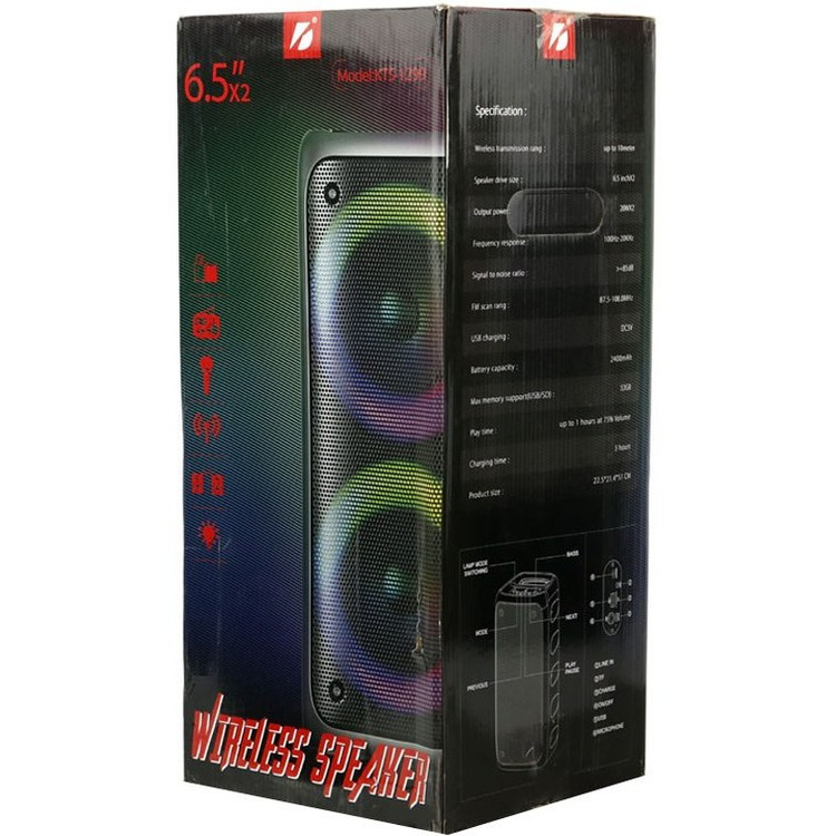 اسپیکر بلوتوث قابل حمل KTS با توان خروجی 40 وات و ظاهر شیک و زیبا میتواند انتخاب خوبی برای گوش دادن و لذت بردن از موزیک دلخواهتان باشد. این اسپیکر دارای دو باند 6.5 اینچی و دارای رقص نور RGB می باشد که هنگام پخش موزیک زیبایی چندانی به اسپیکر میدهد. پشتیبانی از کارت حافظه و فلش مموری ، بلوتوث ، ورودی AUX و قابلیت اتصال میکروفن از ویژگی های این اسپیکر قدرتمند می باشد .